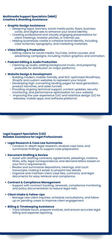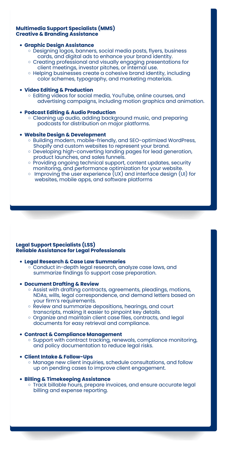Free up time for critical legal work by outsourcing clerical tasks, case research, document preparation, client communication, and other essential support services to a trained legal specialist.